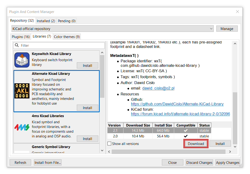 KiCad offers a built-in package and content manager that can be used to easily download and manage third-party plugins, themes and libraries.